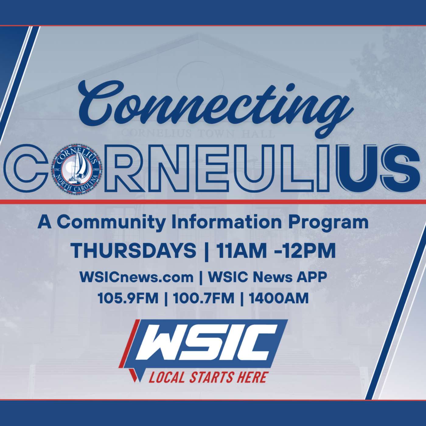 Connecting Cornelius is a community information podcast focused on the Town of Cornelius, North Carolina. Hosted by town leadership—including Mayor Denis Bilodeau, commissioners, and town representatives—the show provides timely updates, insight into local initiatives, and conversations that matter to residents. Each episode serves as a direct connection between local government and the community, offering clear, reliable information in one convenient place. New episodes air Thursdays from 11 a.m. to 12 p.m. on WSIC and are available wherever you get your podcasts.